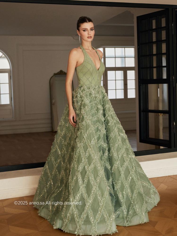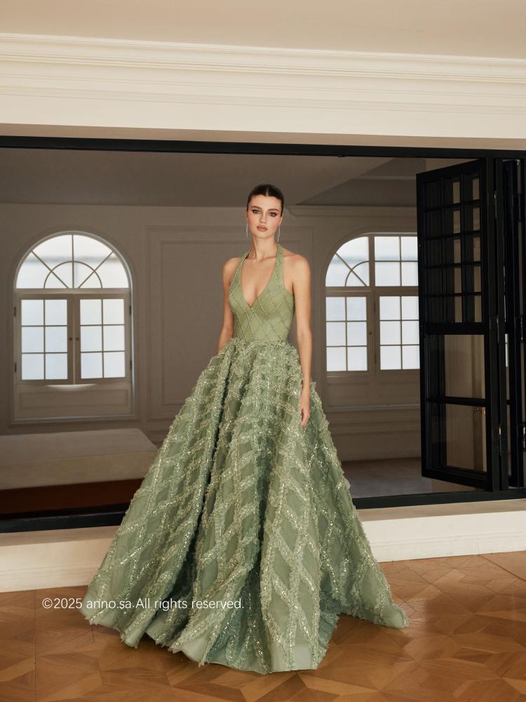 الصدر يتميز بقصة على شكل حرف V، تضفي لمسة أنثوية جذابة ومفعمة بالأناقة، بينما تنساب التنورة الواسعة بانسيابية لتخلق حضورًا ساحرًا ومبهرًا مع كل خطوة.