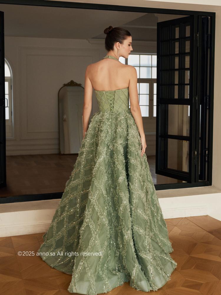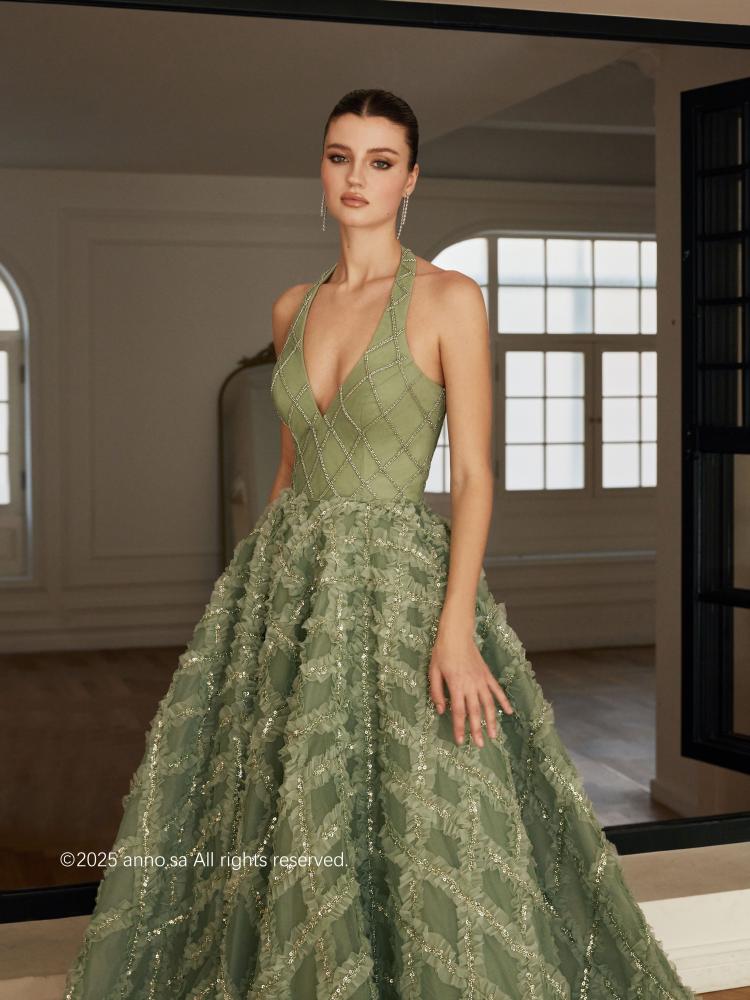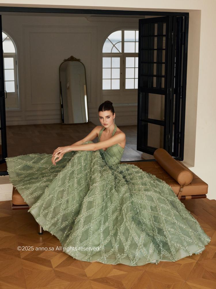 كل تفصيل يعكس الدقة والمهارة في العمل اليدوي، مما يجعل هذا الفستان تحفة فنية تناسب المناسبات الراقية.