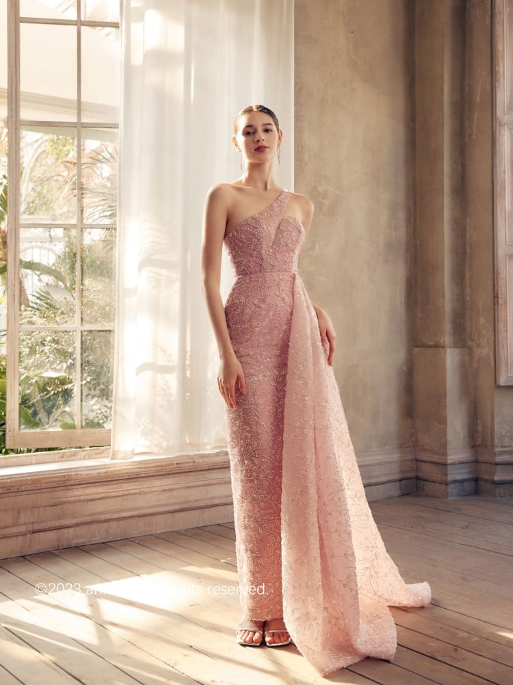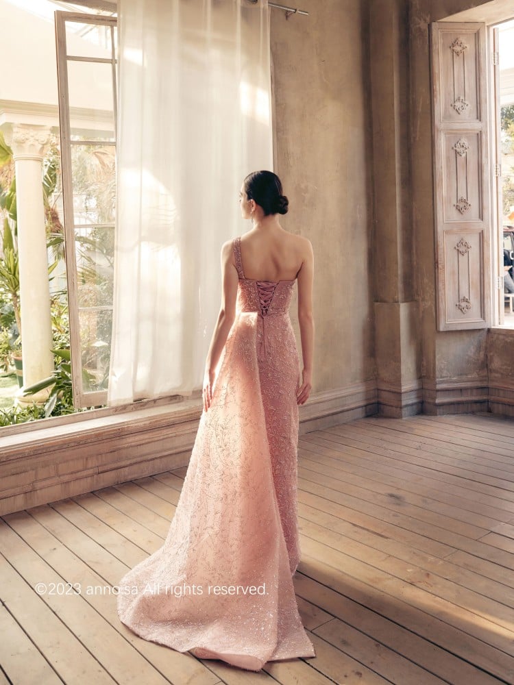 فستان راقي يجسد الأنوثة والفخامة، باللون الوردي الناعم بتطريز برّاق يكسو الفستان بأكمله. يعكس الضوء بطريقة مثيرة للإعجاب، مما يضمن لمعانًا ساحرًا مع كل خطوة. بتصميم أنيق غير متماثل بكتف واحد، يضيف لمسة عصرية على الطابع الكلاسيكي للفستان.